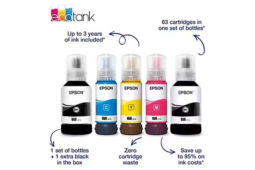 Description Check out the video: Check out the video: Check out the video: Save up to 95% on printing costs* with Epson’s cartridge-free EcoTank printers. Supplied with high yield ink bottles, the integrated ink tanks are easy to fill thanks to the specially engineered ink bottles. With no cartridges to replace, and flexible connectivity features, this is the perfect printer for anyone looking for high-quality prints at an incredibly low cost-per-page. Say Goodbye to Cartridges EcoTank provides hassle-free home and office printing the ultra-high capacity ink tanks allow mess-free refills and the key-lock bottles are designed so only the correct colour can be inserted. The front ink level display means it's easy to see when it's finally due for a refill and the stylish blue light on top of the ink tank cover also means you can monitor your printer's status at a glance. Keep on Saving This economical printer saves you up to 95% on printing costs and comes with up to 3 years' worth of ink". The included ink bottles deliver up to 15,100 pages in black and white and 5,500 in colour, the equivalent of up to 63 cartridges worth of ink!" Packed with Features Featuring a 250-sheet front paper tray, borderless photo printing (up to A4) and fast print speeds of up to 18 pages per minute", you can speed through a variety of tasks with ease. Additional benefits include a 30-page automatic document feeder, a user-friendly 6.1cm LCD screen, automatic double-sided printing, scanning and copying, and a convenient output tray that automatically opens when printing. A media window also lets you quickly check your paper level. Built to Last Heat-Free Printing Technology means the printhead will last the lifetime of the printer so you can benefit from no unnecessary replacement parts or upgrades, as well as reduced power consumption compared to laser printers. It is also engineered to prevent nozzle clogging. Highly durable, the printer comes with a 100,000 page. Modern Flexibility Featuring a compact design and Wi-Fi, Wi-Fi Direct and Ethernet connectivity, you can easily integrate this printer with your existing home set-up and print from mobiles, tablets and laptops*. With support for dual-band and mesh Wi-Fi networks, the speed and reliability of your printer's wireless connection is optimised to deliver a fast and seamless printing experience. Epson Smart Panel App This app enables you to control your printer from your smart device*. You can print, copy and scan documents and photos, set up, monitor and troubleshoot your printer, all from your phone or tablet. Save Up to 95% on Printing Costs with Refillable Ink Tanks Stress-free, convenient printing with up to 63 cartridges worth of ink in one set of bottles. A4 Multifunction Printer with Double-Sided ADF High quality, double-sided print, copy and scan in one machine. Simple, Hassle-Free, Ink Tank System Lets you Refill from Bottles The EcoTank key-lock bottle system ensures it's mess-free. Reliable Wireless Connectivity Lets you Print from Anywhere Use the Epson Smart Panel app to set up, monitor, print and more from your mobile. What's in the Box: 1 set of ink (1x 127ml bk, 3x 70ml CMY) + extra black Power cable Product Features: Printing method: Precisioncore print head Ink technology: Pigment black and dye colour inks Panel: Type: color, diagonal:6.1 cm Emulations: ESC/P-R Black yield: 15,100 pages Colour yield: 5,500 pages Double-Sided scanning Scanner type: Contact image sensor (CIS) Duplex: Yes (A4, plain paper) Automatic document feed: 30 pages Scan: Optical Resolution: 1200 x 2400 DPI