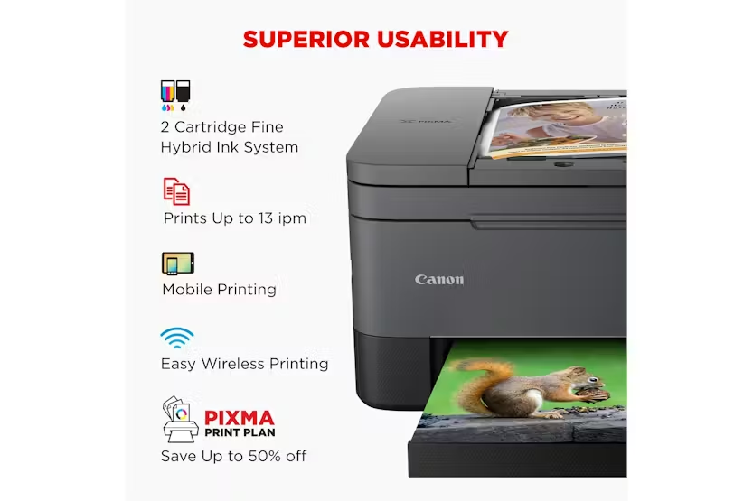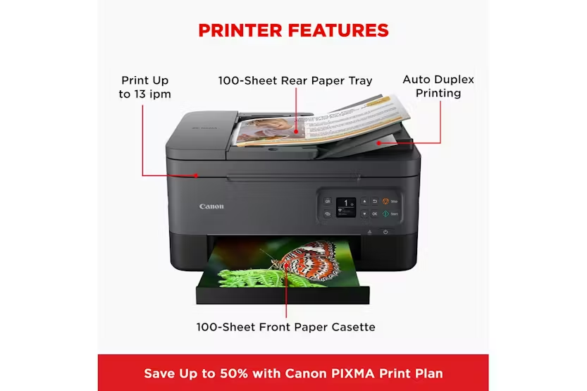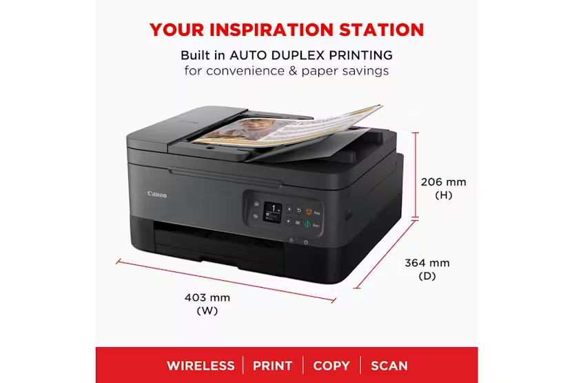 Description ONLINE ONLY Boost Efficiency with the CANON PIXMA TS7450I Wireless Color AIO Inkjet - Ultimate Utility and Artistic Fun at Your Fingertips Founded on innovative ADF technology and designed specifically to excel in both business and pleasure pursuits, the CANON PIXMA TS7450i Wireless Color AIO Inkjet Printer is a must-have for any driven home office or creative household. Benefitting from an impressive array of features, it beautifully combines productivity with artistic adventure - all coursing through your fingertips in wireless color. Thriving on adaptability, the PIXMA TS7450i is perfect for varying home use. As well as facilitating effective home working with its proficiency to print, scan, and copy from any device - be it computer, tablet or smartphone, attributing to its exceptional Mobile Printing capabilities. Set up has never been easier with the intuitive QR Code Direct Connection – scan the QR code displayed on the LCD and let the intelligent technology work its magic. Navigate the printer with simplicity using the Canon PRINT app. Aesthetically appealing with a sleek, compact design, this remarkable 3-in-1 pixma is perfect for enhancing any workspace or home. Unlike any other printer, this incredible device surpasses mere professional utility. Overflowing with creativity, the PIXMA TS7450i allows you to print on various kinds of media, including photo paper, restickable paper, and even iron-on transfers or magnetic paper. Indulge in creative projects with children or let your own inner artist loose, without sacrificing print quality or speed. A 10 x 15 cm borderless photo prints in just around 43 seconds, ensuring you waste minimum time waiting for your stunning outputs. The PIXMA TS7450i also lets you scan and copy multiple sheets rapidly without the need of continuously removing or reloading papers, saving considerable time and effort. Simultaneously, enjoy the convenience of automatic 2-sided printing and copying: save not only money but also contribute your bit towards creating a more sustainable future. With the added bonus of compatibility with the PIXMA Print Plan, you get a monthly subscription for inks, based on the number of pages you print, further adding to its appeal. Product Featuures Wireless printing with a click on your device Enhanced speed with ADF technology for quicker scanning and copying Broad media compatibility to foster creativity You can print a 10 x 15 cm borderless photo in approximately 43 seconds Ink delivery through the PIXMA print plan Automatic 2-sided printing and copying for efficient paper usage With the CANON PIXMA TS7450I Wireless Color AIO Inkjet, harness the power of proficient productivity and imaginative ingenuity - make it a central feature of your home workspace and artistic playground. Canon Why Buy The PIXMA TS7450i Printer Play Button Play Button Play Button Play Button