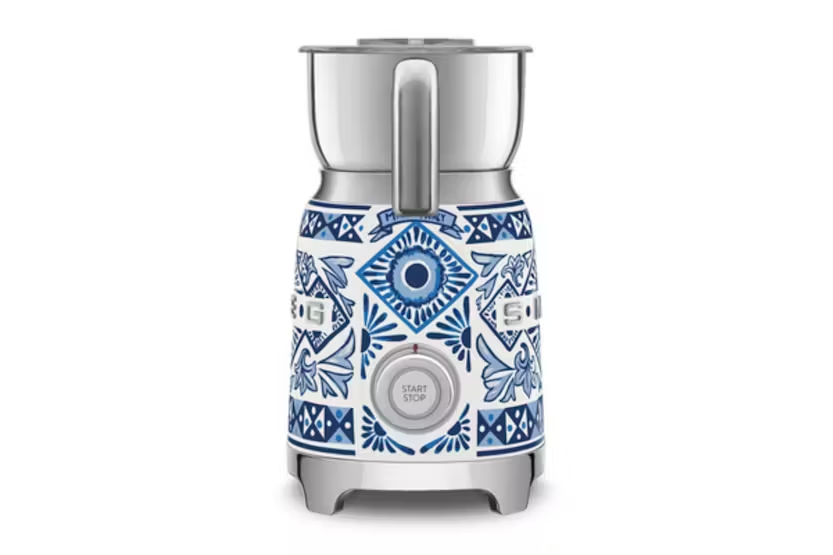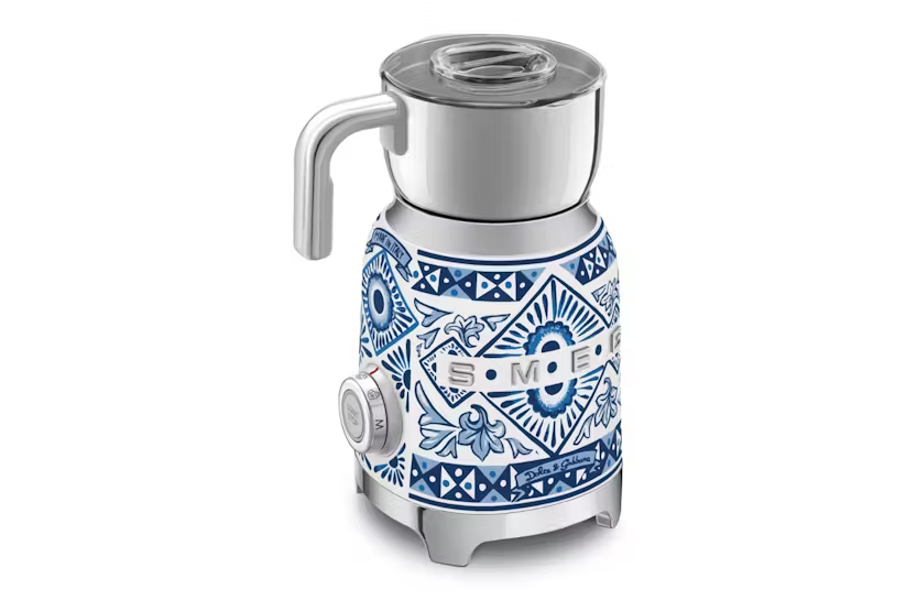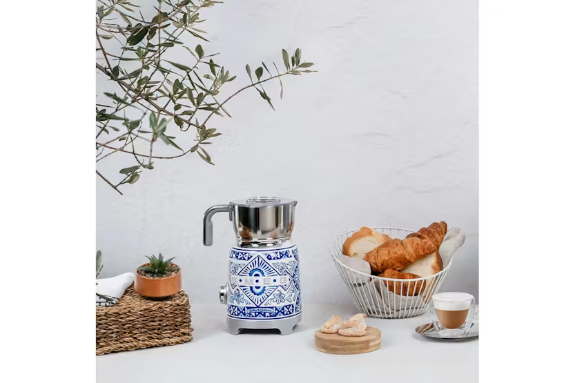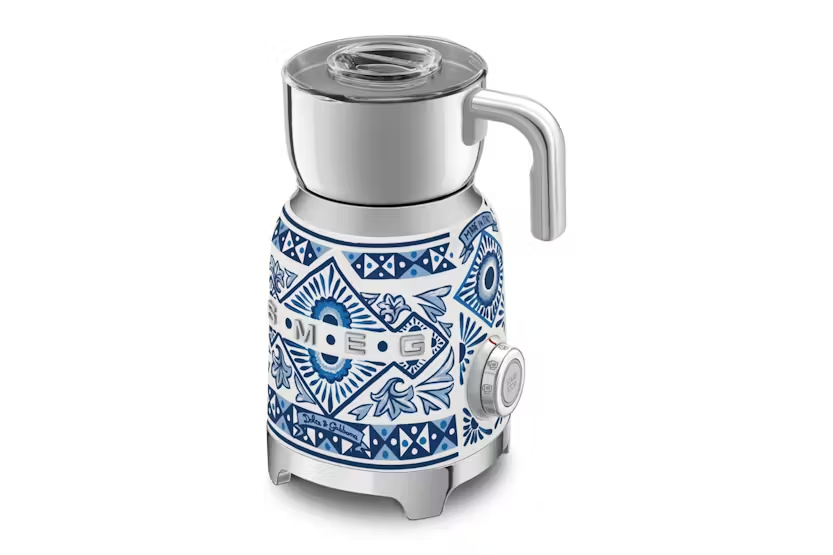 Description Milk Frother Experience professionally frothed milk in an instant. Whether you love frothy cappunccinos, velvety hot chocolates or cold frothed milkshakes, Smeg's electric milk frother includes six pre-set programmes and different whisk options to the simple preparation of hot and cold foamed drinks. Product Features: Milk frothing jug capacity: 250 ml / 1 cup Voltage: 220-240 V Frequency (Hz): 50/60 Hz Power supply cable length: 1 m Integrated cord: Yes Type of controls: Button, knob Body material: Stainless steel Lid material: BPA-Free plastic Measuring cup material: BPA-Free plastic Handle material: Plastic Blue mediterraneo Milk and chocolate heating jug capacity: 600 ml / 2.5 cup
