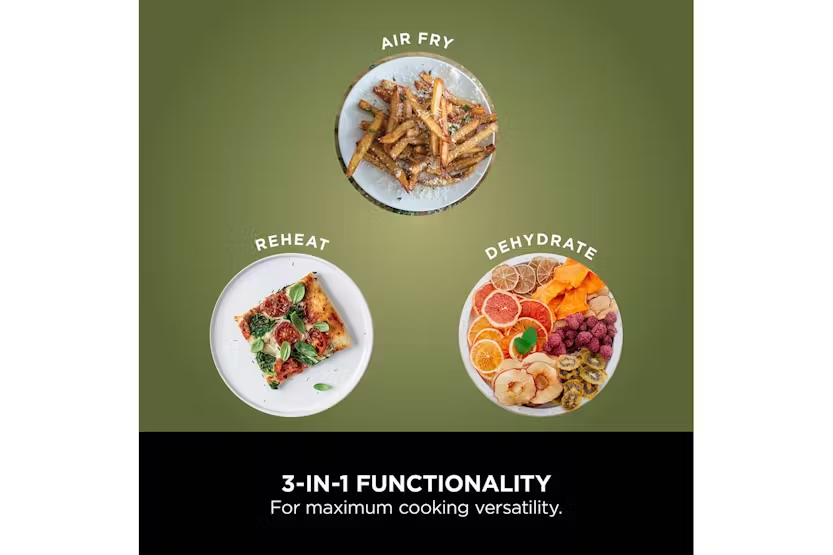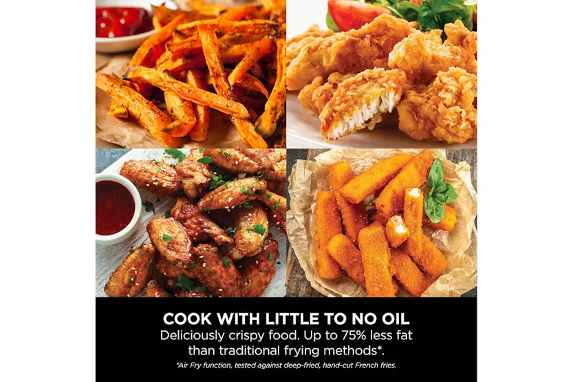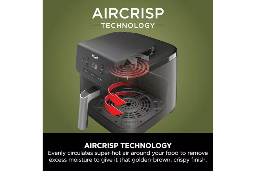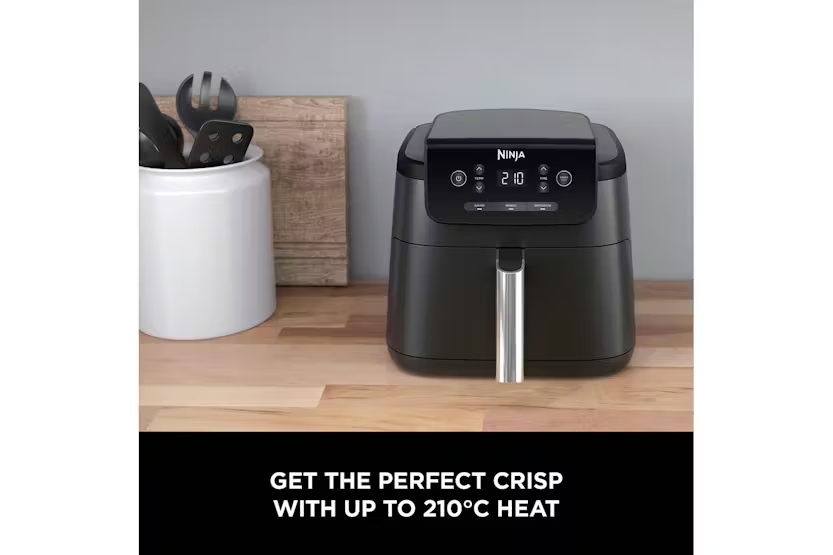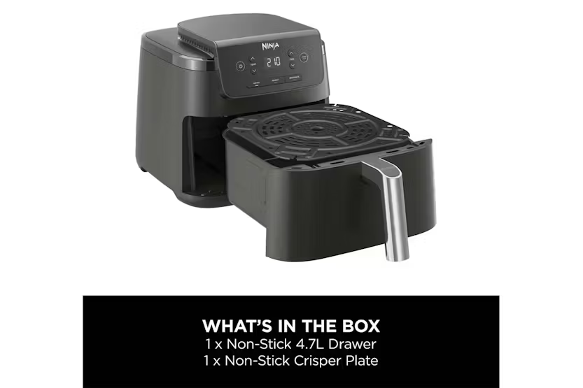 Description Crispy Results, Every Time Whether you’re new to air frying or ready to upgrade, this compact single-drawer air fryer quickly cooks food using little to no oil. AirCrisp Technology surrounds food with superheated air for hot, crispy results. Looking for an air fryer for 2 people? The generously-sized 4.7L drawer easily fits a whole 1kg chicken or up to 500g of fries – perfect for single people and couples. Up To 75% Less Fat* A healthy air fryer? Air Fry using little or no oil for healthier cooking – up to 75% less fat than traditional frying methods*. Perfect for cooking and crisping your favourite fresh and frozen foods. Three Cooking Functions Air Fry, Reheat and Dehydrate your way to delicious homemade food. This digital air fryer is easy to control, with a wide temperature range of 40-210°C, and a countdown timer which automatically stops cooking when time is up. Easy To Clean The removable drawer and crisper plate are both non-stick and easy to wipe clean. Crispy results, every time. The Ninja Air Fryer quickly cooks your favourite foods using little to no oil, for healthier frying – up to 75% less fat than traditional frying methods*. Get the perfect crisp with up to 210°C heat. AirCrisp Technology rapidly surrounds food with superheated air for hot, crispy results every time – and it uses up to 65% less energy than an oven**. Whether you’re new to air frying or ready to upgrade, this compact air fryer is the perfect choice. It’s easy to use with digital controls and three versatile cooking functions: Air Fry Up to 75% less fat than traditional frying methods*. Create healthier version of your fried favourites, from burgers and koftas to frozen chips and fish fingers. Experiment with everyday dishes, from juicy chicken breasts and jacket potatoes to crispy spring rolls and filo parcels. Or try something totally new, like air fryer nachos or pizza rolls. Dehydrate Slowly remove moisture from sliced fruit, vegetables, herbs or other ingredients to create healthy homemade snacks, garnishes and flavourings. Reheat Gently restore leftovers to that just-out-of-the-oven texture and taste, without sogginess. Perfect for pizza, spring rolls and more. Large Capacity, Small Footprint The 4.7L drawer is perfect for feeding up to 2 people, or just cook enough for 1, without taking up precious space on your worktop. A removable crisper plate ensures air circulates evenly around your food for 360° crisping. Simple digital controls No fuss – easily set the cooking function, temperature and timer at the touch of a button. A wide temperature range of 40-210°C means you can do everything from gently reheating leftovers to crisping a golden toasted sandwich with a melted cheese middle. Ninja know life is busy and full of distractions, so Ninja air fryers automatically stop cooking when the digital timer ends. Don’t worry about the washing up – the removable drawer and crisper plate are both non-stick and easy to wipe clean. Notes: *Tested against deep-fried, hand-cut french fries **Testing and calculations based on recommended cook time for sausages, using air fry function versus conventional ovens What's in the Box: 1 x Main unit 1 x 4.7L Drawer 1 x Crisper plate Product Features: Single-drawer air fryer fits a whole 1kg chicken: best for 1-2 people Cook using up to 65% less energy than an oven* Healthier frying: up to 75% less fat than traditional frying methods**