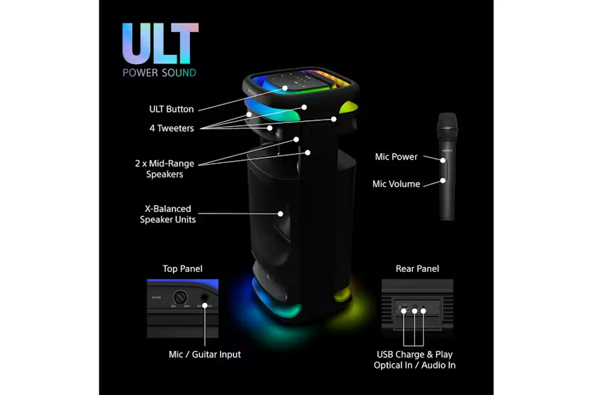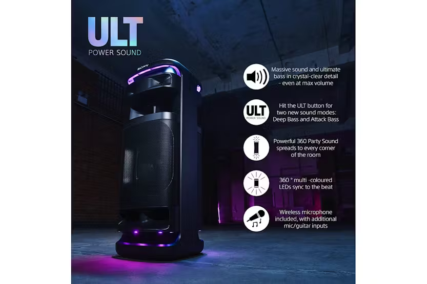 Description Delivery Only - Free Shipping! Bring the power of live-venue sound to your home with the ULT Tower 10. Select between two different types of exceptional bass at the push of a button and experience an X-Balanced Speaker Unit that reduces distortion and improves vocal clarity, thanks to improved sound pressure. Plus, get your karaoke on, thanks to the complimentary wireless mic. Tower party speaker with enhanced low-end frequencies for exceptional bass, an X-Balanced Speaker Unit for less distortion and greater vocal clarity, dynamic lighting, wheels for ease of movement and a wireless mic to use for karaoke. Bring the Live Concert Feel to Your Place Enhance your low-end frequencies for exceptional bass and feel how powerful the sound is. Enjoy two different types of bass-emphasised sound. Powerful bass to feel the beat and get you dancing. Deep bass boost for low-frequency sound that will make your heart tremble. Bathe in powerful sound and feel the energy of a live concert venue anywhere. Hit the Button. Feel the Bass. Press the ULT button to enjoy the powerful sound of ULT1 and ULT2. Select ULT1 for deeper, lower frequency bass. Select ULT2 for powerful, punchy bass. Powerful Sound Everywhere 360º Party Sound carries powerful sound to every corner of the room. Four tweeters deliver clear sound to both the front and rear of the speaker, with two mid-range speakers for vocal clarity. Feel the bass sound, thanks to the large X-Balanced Speaker Unit. Together, they let everyone in the room feel the power of the music, wherever they are. Powerful Sound With X-Balanced Speaker Unit Our X-Balanced Speaker Unit features an almost rectangular diaphragm, for an increased surface area compared to conventional speaker units. The approx. 320 mm x 320 mm large woofer unit gives clear and deep bass sound. A Richer, Clearer, Deeper Experience The non-circular diaphragm not only maximises the area of speaker, but also increases sound pressure for deeper, punchier bass, less distortion and greater vocal clarity. All designed to elevate your listening experience. The Freedom to Get Your Karaoke On Belt out your favourite tunes, thanks to the included wireless mic, and enjoy complete control of your sound, with Echo and Key Controls on the top panel. You can plug in another microphone for a duet or a guitar to play along using the ULT Tower 10 as an amp. Wireless Microphone The Sony original wireless mic is included, so you're ready for all the fun of karaoke right out of the box. Complete Karaoke Control By using the Echo and Key Controls functions on the top panel, how you sound is up to you. You'll also find a wired input for a second microphone or guitar, to use the ULT Tower 10 as an amp. Enjoy Karaoke with the Fiestable App Control the Echo, Key and volume functions from the free Fiestable app. You can even turn on the vocal cancelling function, to give your own voice to your favourite playlists. TV Sound Booster Sony's unique function, TV Sound Booster, lets you enjoy enhanced audio-visual sound, watching everything from live performance videos to movies. With deep bass and realistic high-frequency sound spread, you get a true audio-visual experience that draws you right into the action. The ULT Tower 10 ramps up your TV sound with the X-Balanced Speaker Unit, while tweeters on the rear help fill the room with pure sound. Connect TV and ULT Tower 10 Connect the ULT Tower 10 to your TV using the supplied optical cable. Activate TV Sound Booster in the Sony | Music Center App Switch on TV Sound Booster in the Sony | Music Center app. Activate the Sound of ULT Tower 10 and TV 1. Play content on TV.2. Adjust the TV volume using its remote control so that you can hear voice or dialogue.3. Adjust the volume of the ULT TOWER 10 from the Music Center so that the bass sound is as loud as you like. How it Works A powerful combination of TV sound, the ULT Tower 10’s two rear tweeters, and the X-Balanced Speaker Unit gives you an upgrade on your TV sound, whatever you watch. Big Sound on the Move Grab the convenient carry handle, tilt the speaker back, and wheel it anywhere you like. Its big, stable wheels let you roll it all the way to the party. Splashproof Top Panel Don’t worry about spilling any liquid on the top panel, it’s splashproof, so your music will keep on playing. Music That Really Gets You Moving with Party Connect Link up to 100 compatible[FN|Only compatible between SRS-XB43, XB33, XB23, XP700, XP500, XG500, XG300, XE300, XE200, LSPX-S3, XV800, XV900, XV500, ULT FIELD 7 and ULT Tower 10.Wireless Party Chain functions are not applicable for connection. Firmware update required for current models.] speakers to synchronise music and lighting through Party Connect – fill any location with powerful sound to create the ultimate party atmosphere. Add an Extra Speaker for Rich Stereo Sound with Stereo Pair Connect two ULT Towet 10 speakers via Bluetooth to activate stereo sound (left and right), to experience a rich sense of presence. USB Play, and Charge Devices Plug in and play music with USB connectivity, and you can use the ULT Tower 10 to charge up your other devices. Sony | Music Center Optimise audio settings, select playlists, and control Party Connect. Manage your devices right from your phone with the Sony | Music Center app. Fun Features with Fiestable Control fun features, such as DJ Control and the lighting function, from your phone with this app. Bluetooth Fast Pair and Multipoint Connection In one tap, the ULT Tower 10 enables quick, effortless Bluetooth pairing with your Android devices. For total convenience, you can pair your ULT Tower 10 with two Bluetooth devices at the same time, to switch instantly between different music sources. Aiming for a Zero Environmental Footprint Inspired by the beauty of the world, we are doing our part to help preserve the Earth while still offering superior sound quality and listening experience. With a goal of achieving a zero envir