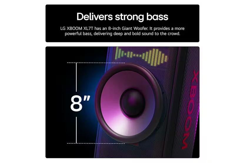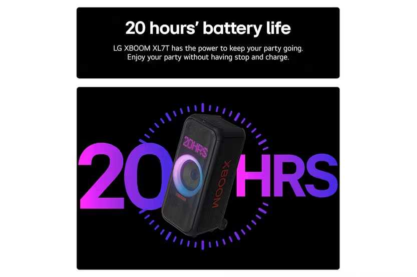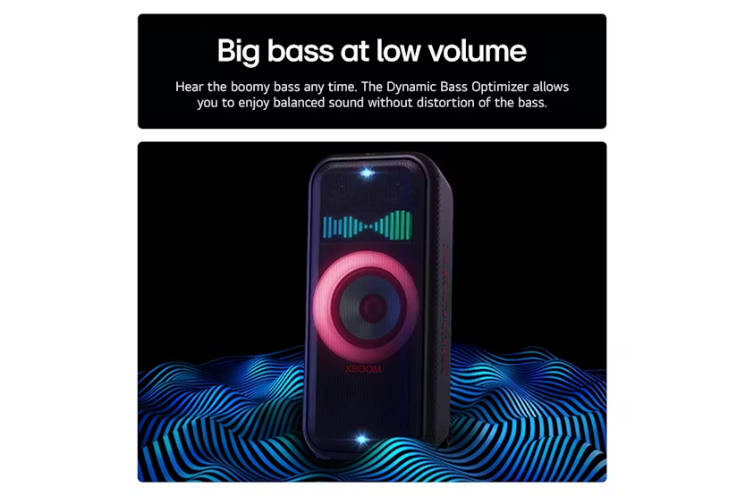 Description Sounds Bold. Play Out Loud Kick the party up a notch with LG XBOOM DXL7T. It sounds extra large and also has various entertainment. Check out the video: Feel Extremely Massive Sound Meet the powerful-in-class party speaker - LG XBOOM DXL7T. It produces immense sound, booming bass, and clear high notes. Boom up the party and share connected excitement. 250W Output: Huge Enough to Fill the Venue LG XBOOM DXL/T is made for large parties. It offers bigger output to create an extreme sound for the venue. One Giant Woofer: The One that Delivers Strong Bass LG XBOOM DXL7T has an 8-inch Giant Woofer. It provides a more powerful bass, delivering deep and bold sound to the crowd. Dynamic Bass Optimiser: Feel that Bass Even at Low Volume Hear the boomy bass any time. The Dynamic Bass Optimiser allows you to enjoy balanced sound without distortion of the bass. *The sound may vary depending on the sound source. 2.5-inch Dome Tweeters: Crisp and Clear Sound Whether inside or outside hear high-frequency notes clearly. It has two 2.5-inch dome tweeters, delivering better sound. *Image simulated for illustrative purposes. Check out the video: XBOOM Party Lightings: Make Your Party Mesmerising LG XBOOM Party Lightings make a party lit. You can create a party light show while astounding your crowd with text or animations. The flashy double strobe lightings will captivate the crowd. Dynamic Pixel Lighting: Expressing Excitement in Text Mode Experience the evolution with LG XBOOM DXL7T. It has a LED panel to display text. Type your message through the XBOOM App. *IPX4-rating tested in fresh water. Speaker should not be submerged in water. Use with caution around bodies of water, such as swimming pools or the ocean. Check out the video: Dynamic Pixel Lighting: Pixel Art Brings Waves of Fun Dynamic Pixel Lighting also offers animation presets. You can display colourful patterns, visual EQ, or characters on LED panel. Check out the video: Express More Multi Colour Ring Lighting: Be More Festive with Ring Lighting LG XBOOM DXL7T presents a beat-driven light show - Multi Colour Ring Lighting. The light dance along with your music bringing dynamic energy to the party. Customise Your Party Lighting Use My Pick on the XBOOM app to customise your very own party lighting. You can also choose animation or type a message for the crwods to double boom up the fun. *All pictures shown are for illustration purpose only. Actual product may vary due to product enhancement. **IPX4-rating tested in fresh water. Speaker should not be submerged in water. Use with caution around bodies of water, such as swimming pools or the ocean. Find the Musician in You Mic & Guitar In: Hold Your Own Concert With LG XBOOM DXL7T, you can turn the event into karaoke. Plug in your microphone and sing your heart out. You can also connect in a guitar and hold an acoustic concert of your own. Take it Everywhere, Enjoy Anytime Go with LG XBOOM DXL7T wherever you like to share the music. It is built to keep up in the outdoors, so it travels with you everywhere without any worries. Grab and Move With telescopic handle and wheels, carrying LG XBOOM DXL7T got extremely easy. It also tilts back, so you can carry it like a luggage. IPX4 Water Resistant LG XBOOM DXL7T meets an IPX4 Water Resistant rating; it can withstand water splashes. *IPX4-rating tested in fresh water. Speaker should not be submerged in water. Use with caution around bodies of water, such as swimming pools or the ocean. 20 Hours of Battery Life LG XBOOM DXL7T has long battery life, so you can turn music up anytime without worrying. *20-hour battery life is based on using 50% volume and no lighting. Battery life varies by use, settings, and environmental conditions. What's in the Box: AC Adaptor Product Features: 250W Output & 8-inch woofer: Fill up the venue with huge sound Light up the party: Dynamic pixel lighting & multi colour ring lighting Take it everywhere: Telescopic handle & wheels Enjoy music anytime: 18 hours of battery life Mic & guitar in: Sing along to the music IPX4: Handle some splashes Battery indicator Security lock Bluetooth app (Android/iOS) Audio format: SBC, AAC Power supply: AC adaptor jack Tweeter unit type: Cone Connectivity: 1 x USB Read More