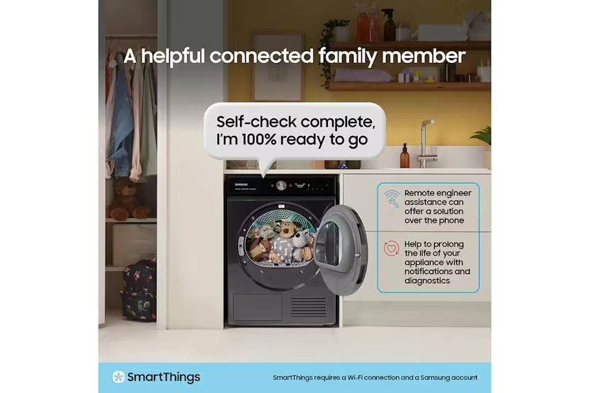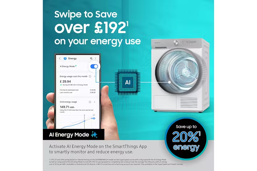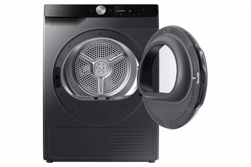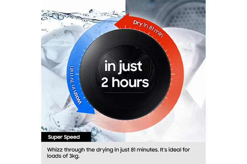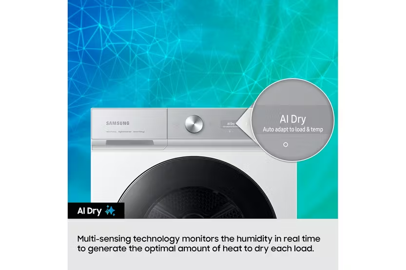 Description Intelligently Efficient Check out the video: Auto Enhanced Drying*: AI Dry+ Enjoy faster and more precise* drying which reduces energy use by 20%** and drying time by 20%**. AI Dry+’s multi-sensing technology detects 4 types of fabrics*** and adjusts its performance to dry items. It monitors humidity of the clothes and generates the optimal amount of heat for each load. * Based on an AI-created algorithm. Actual results may vary depending on individual use.** Tested on the Samsung DV8400D compared with Samsung DV5000D on Eco Cotton and AI Dry+ cycle. Use blended shirts of 2kg load.***Based on an advanced AI algorithm, utilizing weight, moisture content and drying temperature data, it can detect four types of fabric: normal, denim, towels and delicates.**** Must check the clothing care label before using the AI Dry+ cycle. Check out the video: Sensor Intelligence: AI Dry Enjoy fast and precise* drying that is gentle on clothes. AI dry monitors the humidity of the clothes in real time and intelligently generates the appropriate amount of heat to suit the weight and moisture content of each load. So it reduces the energy use by 10%** and drying time by 15%***. * Based on an AI-created algorithm. Results may vary depending on the actual usage conditions.** Based on internal testing on the DV9400B model, using the Cotton and AI Dry cycle to dry a mixed 2kg load with 43% moisture content, compared to a conventional Samsung model, DV5000T. Result: energy consumption is reduced by 10%. Results may vary depending on the actual usage conditions.*** Based on internal testing on the DV9400B model, using the Cotton and AI Dry cycle to dry a mixed 2kg load with 57% moisture content, compared to a conventional Samsung model, DV5000T. Result: the cycle time is reduced by 15%. Results may vary depending on the actual usage conditions. Check out the video: Intelligent Drying: AI Control Dry laundry easily and effectively with AI control. It personalizes drying by remembering your habits, suggesting cycles* and displaying timely information. The smartthings app** offers advice on cycles, planning and troubleshooting. And it selects the suitable drying course for a wash cycle***. * Messages with cycle suggestions are displayed on a smartphone App.** Available on Android and iOS devices. A Wi-Fi connection and a Samsung account are required.*** Auto Cycle Link is only available when both the washer and dryer have AI Control and Wi-Fi connected. Efficiency Check out the video: Smart Energy Savings Monitor and reduce your dryer’s energy use. AI energy mode* lets you easily check the power consumption and estimates your electricity usage. When selected on certain courses**, it helps you reduce energy use by up to 20%*** by adjusting the speed of the inverter compressor and the cycle time. * Available on Android and iOS devices. A Wi-Fi connection and a Samsung account are required. Limited to applicable appliances connected to SmartThings.** Can be applied on the SuperSpeed and Towels courses.*** Based on internal testing on the DV8400D model, using the SuperSpeed course to dry a 5kg load. Results: Power consumption without AI Energy Mode = 0.885kWh. Power consumption with AI Energy Mode = 0.637kWh. Results may vary depending on actual usage conditions. Performance Dry in 81 Minutes* Performance Durable motor Durable motor Purchase with confidence any Samsung Washer model with a Digital Inverter Motor and receive a 20 year warranty* on the motor. * The 20 year parts warranty is only applicable to the inverter motor, as of dec 2022. Enhances drying Enhances drying Enhance your drying performance effortlessly! OptimalDry uses 3 sensors to dry clothes effectively. It monitors the humidity level and adjusts the drying time, so laundry is ready quickly, while saving energy. It also stops clothes from being damaged and reminds you to clean the Heat Exchanger. Play Video Dry in 35 minutes Get the clothes you need dried fast, like a work shirt or school top. The Quick Dry 35' cycle gets a small 1kg load of clothing dry and ready to wear in 35 minutes*. Using a high heat it can rapidly dry a few items whenever you are in a hurry – just dry the clothes you need, when you need them. * Based on internal testing, using Quick Dry 35' and an IEC (synthetic) 1kg load. Results may vary depending on the type of fabric. Using QuickDrive™ may increase your energy usage. Dry in 81 minutes* Dry in 81 minutes* Get clothes clean and ready to wear in just 2 hours, while saving energy. The Super Speed course can dry a mixed load of cotton and synthetics in 81 minutes*. And with a Super Speed washing machine you can wash and spin clothes in 39 minutes*. So garments can be washed and dried in 2 hours. * Based on internal testing on the DV8400D model, using the Super Speed course to dry an IEC (cotton + synthetic) standard 5kg load. Results may vary depending on the actual usage conditions.** Based on internal testing on the QuickDrive™ WW9400B model, using the Super Speed course to wash an IEC (cotton + synthetic) standard 5kg load. Results may vary depending on the actual usage conditions. Durable Motor Purchase with confidence any Samsung Washer model with a Digital Inverter Motor and receive a 20 year warranty* on the motor. * The 20 year parts warranty is only applicable to the inverter motor, as of dec 2022. Enhances Drying Enhance your drying performance effortlessly! OptimalDry uses 3 sensors to dry clothes effectively. It monitors the humidity level and adjusts the drying time, so laundry is ready quickly, while saving energy. It also stops clothes from being damaged and reminds you to clean the Heat Exchanger. Check out the video: Performance Dry in 81 minutes* Dry in 81 minutes* Get clothes clean and ready to wear in just 2 hours, while saving energy. The Super Speed course can dry a mixed load of cotton and synthetics in 81 minutes*. And with a Super Speed washing machine you can wash and spin clothes in 3