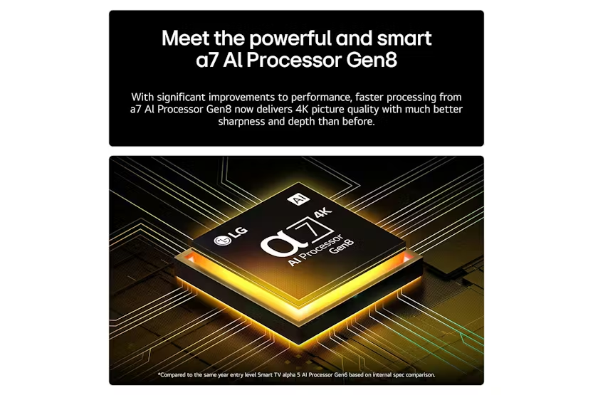 Description See Finer Details with Absolute Clarity Meet the Powerful and Smart Alpha 7 AI Processor Gen8 With significant improvements to performance, faster processing from alpha 7 AI Processor Gen8 now delivers 4K picture quality with much better sharpness and depth than before. *Compared to the same year entry level Smart TV alpha 5 AI Processor Gen6 based on internal spec comparison. 4K Super Upscaling Brings Every Frame to Life LG's powerful processor boosts the resolution to the original quality. Enjoy 4K Super Upscaling enhanced resolution, brightness, and clarity. *Image quality of upscaled content will vary based on the source resolution. HDR10 Pro Vibrant colours and brightness takes the screen resolution to new heights. Jump into elevated image quality with sharper contrast. *HDR10 Pro is a technology developed by LG Electronics based on the standardized picture quality of standard 'HDR10'. The Next Generation of LG AI TV New Upgrade Every Year for 5 Years with Award-Winning webOS Re:New Program Get the benefits from the latest features and software with annual upgrades. A CES Innovation Awardee for the cybersecurity category, feel safe knowing webOS keeps your privacy and data, secure. *webOS Re:New Program applies to 2025 OLED/QNED/NanoCell/UHD TVs. *The webOS Re:New Program supports a total of four upgrades over five years, the threshold is the pre-installed version of webOS, and upgrade schedule varies from month-end to year-start. *Updates and the schedule to some features, applications, and services may vary by model and region. *Upgrades available for 2022 OLEDs and 2023 UHD and above models. AI Sound Pro with Virtual 9.1.2 Channels Al Clear Sound Precision tone correction enhances sound clarity for an exceptional audio experience. Dynamic Sound Booster Powered by Al Processor Al processing enhances TV sound for a more powerful sound experience. All-Encompassing Surround Sound with Virtual 91.2 Channels Get the surround sound experience with just your LG TV. Al uses deep learning algorithms to make it feel as if sound is coming from 9.1.2 channels all around you. *AI Clear Sound must be activated through the Sound Mode menu. *Sound may vary according to the listening environment. WOW Interface Lets you Control Sound Easier from Your TV *Soundbar can be purchased separately. *Soundbar Mode Control may vary by model. *Please note that the service may not be available at the time of purchase. A network connection is required for updates. *The soundbar models compatible with the TV may vary by region and country. *LG TV remote usage is limited to certain features only. Ultra Big TV See all your favourite films, sports, and games on LG Ultra Big TV. Dive into high resolution on a super-scale screen. *UA73 comes in a maximum of 65 inches and inches may vary by region. Powerful Gameplay Experience peak gaming with VRR. Get your game on without lag hindering your performance. *It only works with games or PC inputs that support 60Hz. Filmmaker Mode Experience cinema as the director intended with FILMMAKER MODE, which ensures visuals are as close as possible to their original form. *FILMMAKER MODE is a trademark of UHD Alliance, Inc. *FILMMAKER MODE auto starts on AppleTV+ and Amazon Prime video app. Notes: *The images above in this product detail page are for illustrative purposes only. Refer to the gallery images for a more accurate representation. *All images above are simulated. *Service availability varies by region and country. *Personalized services may vary depending on the policies of the 3rd party application. What's in the Box: Standard remote Power cable (TV attached) Product Features: HGIG mode Game optimiser Filmmaker mode Audio output: 20W Backlight type: Direct Picture mode: 10 modes ALLM (Auto Low Latency Mode) High resolution on a massive Ultra Big TV screen Breathtaking colour and detail with 4K HDR10 Pro Enjoy 4K Super Upscaling enhanced resolution, brightness, and clarity 4K picture quality, upscaled visual and surround sound from the alpha 7 4K AI Processor Gen8 Smart webOS platform with advanced AI functionality plus all your favourite streaming services Read More