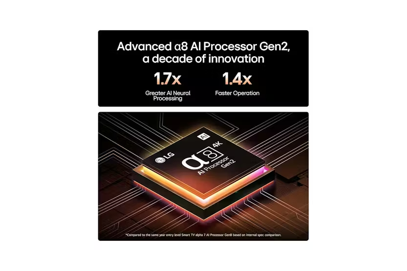 Description See the Details of Every Light and Dark Powered by a8 Al Processor Gen2 *Omdia. 12 years of Number 1 regarding most sold units 2013-2024. This result is not an endorsement of LGE or its products. Visit https://www.omdia.com/ for more details. The Smarter and Faster Alpha 8 AI Processor Gen2 From a Decade of Innovation LG processor’s AI engine is capable of recognizing content by genre. Based on this information, it provides the most optimal picture quality settings to deliver better depth and detail. *Compared to the same year entry level Smart TV alpha 7 AI Processor Gen8 based on internal spec comparison. Experience Perfect Black OLED, Only with LG OLED: Perfect Black Even in Bright or Dark Spaces Perfect Black is UL-verified and delivers true black levels to enhance perceived brightness and contrast, whether it's bright or dark around you. *LG OLED Display is verified by UL for perfect black measured to IDMS 11.5 Ring-light Reflection, based on typical indoor lighting environment (200 lux to 500 lux). *Actual performance may vary depending on the ambient lighting and viewing environment. Perfect Colour 100% Colour Volume and 100% Colour Fidelity certified. Enjoy accurate, vibrant colours even in sunlight or dark environments. *'100% Colour Fidelity' and '100% Colour Volume to DCI-P3' applies to 2025 OLED TVs. *LG OLED Display is verified by UL for Perfect Colour measured to IDMS 11.5 Ring-light Reflection standards. *100% Colour Volume is defined as the performance of display which is equal or greater than the size of DCI-P3 standard colour volume as verified independently by Intertek. *The LG OLED Display is certified by Intertek for 100% Colour Fidelity, measured according to the CIE DE2000 standard with 125 colour patterns. Check out the video: AI Picture Pro Brings Every Frame to Life AI Super Upscaling and OLED Dynamic Tone Mapping analyze each frame's elements to enhance resolution, brightness, depth, and clarity. *AI Picture Pro will not work with any copyright-protected content on OTT services. *Image quality of upscaled content will vary based on the source resolution. AI Magic Remote Completes the AI Experience Control your TV easily with AI magic remote — no extra device needed! With a motion sensor and scroll wheel, point and click to use it like an air mouse or simply speak for voice commands. *AI Magic Remote's design, availability and functions may vary by region and supported language, even for the same model. *Some features may require an internet connection. *AI Voice Recognition is only provided in countries that support NLP in their native language. Check out the video: AI Voice ID LG AI Voice ID recognizes each user's unique voice signature and offers personalized recommendations the moment you speak. *Reduced or limited content may be shown depending on region and network connectivity. *Voice ID support may vary by region and country and is available on OLED, QNED, NanoCell, and UHD TVs released from 2024 onwards. *It works only with apps that support the Voice ID account. AI Search Ask your TV anything. Built-in AI recognizes your voice and swiftly provides personalized recommendations to your requests. You can also get additional results and solutions with Microsoft Copilot. *AI Search is available on OLED, QNED, NanoCell, and UHD TVs released from 2024 onwards. *The US and Korea use the LLM Model. *Internet connection required. AI Chatbot Interact with the AI Chatbot through your AI Magic Remote and address all concerns from configuring settings to troubleshooting. AI can understand user intent and will provide immediate solutions. *Internet connection required. *AI Chatbot available in countries supporting NLP in their native language. *It is possible to link the AI chatbot to customer service. AI Concierge One short press on the AI button on your remote opens up your AI Concierge which provides customized keywords and recommendations based on your search and watching history. *Supported menus and apps may vary by country. *Menus displayed may be different upon release. *Keyword recommendations vary according to the app and time of day. Check out the video: AI Picture Wizard Advanced algorithms learn your preferences by going through 1.6 billion image possibilities. Based on your selections, your TV creates a personalized picture just for you. Check out the video: AI Sound Wizard Choose the audio you like from a selection of sound clips. From 40 million parameters, AI creates a tailored sound profile tuned to your preferences. New Upgrades for 5 Years with aAward-Winning webOS Re:New Program Get full upgrades and enjoy the benefits of the latest features and software. A CES Innovation Awardee for the cybersecurity category, feel safe knowing webOS keeps your privacy and data, secure. *webOS Re:New Program applies to 2025 OLED/QNED/NanoCell/UHD TVs. *The webOS Re:New Program supports a total of four upgrades over five years, the threshold is the pre-installed version of webOS, and upgrade schedule varies from month-end to year-start. *Updates and the schedule to some features, applications, and services may vary by model and region. *Upgrades available for 2022 OLEDs and 2023 UHD and above models. Check out the video: Home Hub, the All-in-one Platform for Your Smart Home Seamlessly manage various LG home appliances, alongside your Google Home devices and more. Experience the ultimate convenience of controlling your whole home through a single, intuitive dashboard. *LG supports 'Matter' Wi-Fi devices. 'Matter' supported services and features may vary depending on the connected devices. Initial connection for ThinQ and Matter should be via ThinQ mobile app. *Use of the hands-free voice function without a remote control is only possible with the alpha 9 AI Processor and alpha 11 AI Processor. It may vary depending on products and regions. Ai Sound Pro Fine-tunes Your Sound for Impact Al Clear Sound Precision tone correction enhances sound clarity 