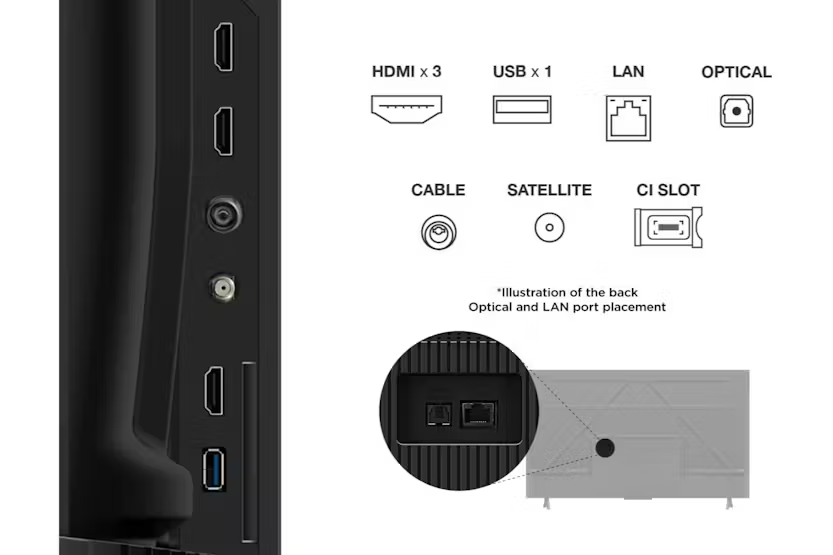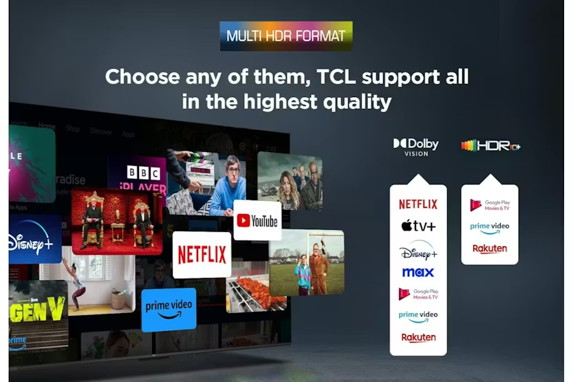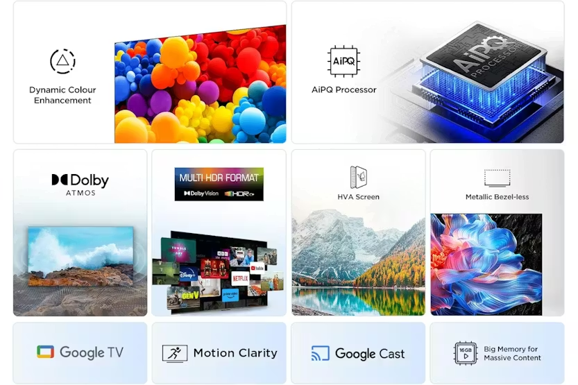 Description 4K HDR: Vivid Accurate Colours and Finest Details 4K HDR reproduces accurately light and dark shades with precise colours and dazzling detail images. Mutiple HDR: See Details in a Detail High Dynamic Range (HDR), the latest standard for UHD contents, provides a superior experience with striking brightness, exceptional shadow details and vivid colours. TCL V6C support all mainstream HDR format, such as Dolby Vision and HDR 10+, which means you could enjoy watching all HDR videos from different content providers like Netflix, Youtube, BBC iplayer, Prime Video, Disney+, etc. Dolby Atmos: Theatrical Sound Enjoyment Dolby Atmos transcends conventional channel limitations to deliver three-dimensional audio. You can experience astounding clarity, increased emotional impact, and immersive, room-filling sound. Dolby Dolby Atmos and the double D symbol are registered trademarks of dolby laboratone. Motion Clarity: Never Miss a Detail in Fast Moving Action Apply MEMC(Motion Estimation and Motion Compensation) algorithm reduces motion display blur, deducts image tearing and guarantees a silky smooth scene, especially in fast-moving scenes. Dynamic Colour Enhancement: Catch the World of Colour Developed exclusively by TCL, Dynamic colour Enhancement is designed to optimize colour vibrancy automatically. A proprietary algorithm expands traditional palette limitations - providing a more vibrant, premium video experience. HVA Screen: Higher Contrast, More Details With innovative technology, TCL self-developed HVA Screen effectively emphasizes stronger and more accurate contrast while removing image halo and ambient light interference, presenting a clearer and more detailed stunning picture quality. The data was quoted from the TCL laboratory. Different best environments/standards may cause deviations in results. AIPQ Processor: A Beautiful Mind TCL's self-developed AIPQ Processor, incorporates numerous TCL's unique image quality tuning algorithms. This chip has excellent intelligent sensing capabilities and can make pixel-level adjustments to the image quality, thus providing a top-notch viewing experience. AIPQ Processor: AI Clarity AI Clarity recognizes the image in detail. It analyzes images based on their original resolution and displays the ultimate crystal-clear visual results in low-resolution upscaling and accurate noise reduction. AIPQ Processor: AI Colour AI colour perceives images as human eyes do.It recreates images by tuning multi-specs including colour volume, saturation and contrast. The vibrant hues in front of you have been recreated and fixed in a lifelike manner with a touch of artistic flair. AIPQ Processor: AI HDR Ai HDR makes your TCL TV mighty intelligent to decode multi HDR formats. It's more than just natural colours, brightness, and darkness; all you see is what the content developer intended when they created it. AIPQ Processor: AI Contrast Ai Contrast reveals the extreme situation of an image. It reproduces reality by optimizing the contrast ratio dynamically to accommodate different visual scenarios including darkness, brightness, and numerous details. Google TV: Just for You Discover new movies and shows from across your subscriptions and content available to you. Suggestions based on what you've watched and what interests you will make it easier to find your next favorite. To enjoy all smart features and services on your TCL Google TV, a free Google account, a free TCL account and a reliable broadband intermat connection are required. Google TV is the name of this device's software experience and a ware experience and a trademark of Google LLC. Hey Google and Google Meet are trademarks of Google LLC Some apps, contents and/or features may not be available in all countries due to avaliabitty internet connection and subscriptions are required. Voice Control: Help on Your Big screen Your TV is now more helpful than ever. Ask Google about the weather, sports scores, and more, and get answers right on the screen. View and control your compatible smart home devices using your voice. Chromecast: Stream From Your Phone Easily cast movies, shows, photos, and more from your phone or tablet, right to your TV. Multiple Eye Care: Ready for a Long Journey With a series of eye care technologies such as low blue light, natural light optimization, flicker less,etc. The TV continues to protect your eye health. All you need to do is to enjoy movies and game. *The eye care technologies are designed to improve viewing comfort and reduce eye fatigue, but they are not intended asmedicaltreatments. *The effectiveness may vary depending on individual usage, viewing environment, and device settings. For any eye health concerns, please consult with a qualified healthcare professional or ophthalmologist. Metallic Bezel-less: More Screens, Less limits The metallic bezel-less design of V6C makes it possible to view content in full-screen. *The actual product (including but not limited to appearance, colour, size) may be slightly different, Please refer to the actual product. *The exterior looking of the TV varies according to different Sizes. Product Features: WiFi 5 Bluetooth: SBC / BT5.2 Game master Hands-free voice control Google assistant built-in Audio power: 10W*2 Contrast ratio: 3000:1 Miracast (wireless display) Read More