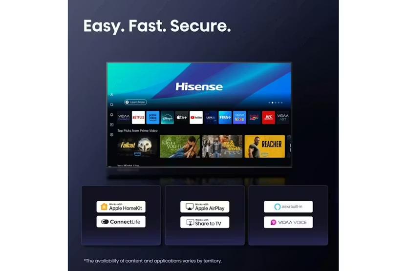Description AI 4K Upscaler Blurry Images Enhanced Close to True 4K Quality Hisense’s AI 4K Upscaler unlocks superior clarity for all your favourite content. This intelligent feature breathes new life not only into your classics, but also modern TV broadcasts, movies and even streaming content—upscaling everything to stunning 4K quality. Every pixel is enhanced to match the full power of your television. AI Smooth Motion Smoother Images Without Blur Enjoy smooth, lifelike visuals with advanced features such as MEMC (Motion Estimation, Motion Compensation) and 3D Noise Reduction. With AI Smooth Motion technology, annoying motion blur is a thing of the past. Whether it’s fast-paced sports or intense action gaming, every movement and sudden turn is rendered with crystal-clear precision, ensuring dynamic scenes appear seamless and true to life. Game Mode Plus Ultra-smooth Gameplay, Incredible Responsiveness Game Mode Plus automatically activates when a gaming connection is detected via ALLM, delivering an ultra-smooth gaming experience with low input lag. Let your Hisense TV help you level up by giving you full control and enhanced responsiveness. Dolby Vision Step Into the Story with Dolby Experience the Dolby difference — a premium entertainment experience that helps you feel a deeper connection to the movies, shows, music, sports and games you love. Discover what you’ve been missing with an immersive experience like no other. Once you experience Dolby, you won’t want to watch any other way. Dolby Audio & DTS Virtual:X Feel the Atmosphere with Immersive TV Sound Movies, TV shows, sports and music sound even better on a Hisense TV with DTS Virtual:X and Dolby Audio. Crystal-clear sound, easy-to-hear dialogue, rich detail and realistic surround sound effects come together to enhance the impact of your favourite scenes and moments. Voice Control Your Voice, Your Command Try the Hisense voice remote and take TV control to the next level of convenience. With a simple press of a button, voice commands are activated. Easily browse shows, adjust the volume, or interact with your TV effortlessly. Game Bar Smooth, Centralised Gaming Management Enjoy your gaming dashboard and manage performance in real time. Easily adjust game settings and monitor gameplay data seamlessly. Play with precision and aim for victory. Colour Precision Pure Expression of Colour When standing in front of a masterpiece, you realise every shade tells a story. With Hisense’s colour precision, see beyond the surface and experience every vibrant nuance as part of a richer emotional tapestry. AI Light Sensor Smart Brightness for Comfortable Viewing No matter the time of day, your TV automatically detects and adjusts screen brightness according to ambient light to reduce power consumption. Balance energy savings with optimal viewing quality. Content Sharing Click, Cast, Enjoy Switching between devices is a thing of the past. Hisense Share to TV lets you project your favourite content directly from your device to your television. Mirror or share—it’s your choice, completely hassle-free. Multiple Sizes Find the Size That Fits Your Space Hisense offers a full range of screen sizes to suit your home perfectly, whatever your needs. VIDAA Smart TV Easy. Fast. Secure. Global and Local Entertainment Welcome to the future of television. Hisense advanced operating system seamlessly brings together your favourite international and local content, tailored to your preferences and easy to find. Dive into endless entertainment with top-rated shows, blockbuster movies and more—personalised and instantly accessible. Take control of your entertainment experience today. EZPlay Control Your Sound Setup The EzPlay remote transforms your home entertainment system by effortlessly pairing your Hisense TV with a soundbar and bringing soundbar controls directly onto the TV screen. Hisense TV Sound Companion Better Together Hisense soundbars are designed to work in perfect harmony with Hisense TVs. Features such as Hi-Concerto, TV Mode, Room Fitting Tuning and EzPlay create a seamless, unified audio-visual experience. Hi-Concerto, Room Fitting Tuning and TV Mode work with selected Hisense TV and soundbar models. Product Features AI 4K upscaler AI smooth motion Game mode plus Audio technology: DTS virtual:X
